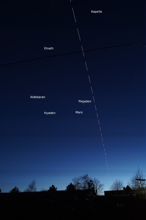Mit im Bild sind die offenen Sternhaufen der Hyaden und Plejaden. Mars läuft gerade zwischen beiden, gerne auch das "Tor der Ekliptik" genannt, hindurch. Im oberen Bildviertel prominent zu sehen ist Kapella, der Hauptstern im Sternbild Fuhrmann. Unten angefügt ist ein annotiertes Bild.