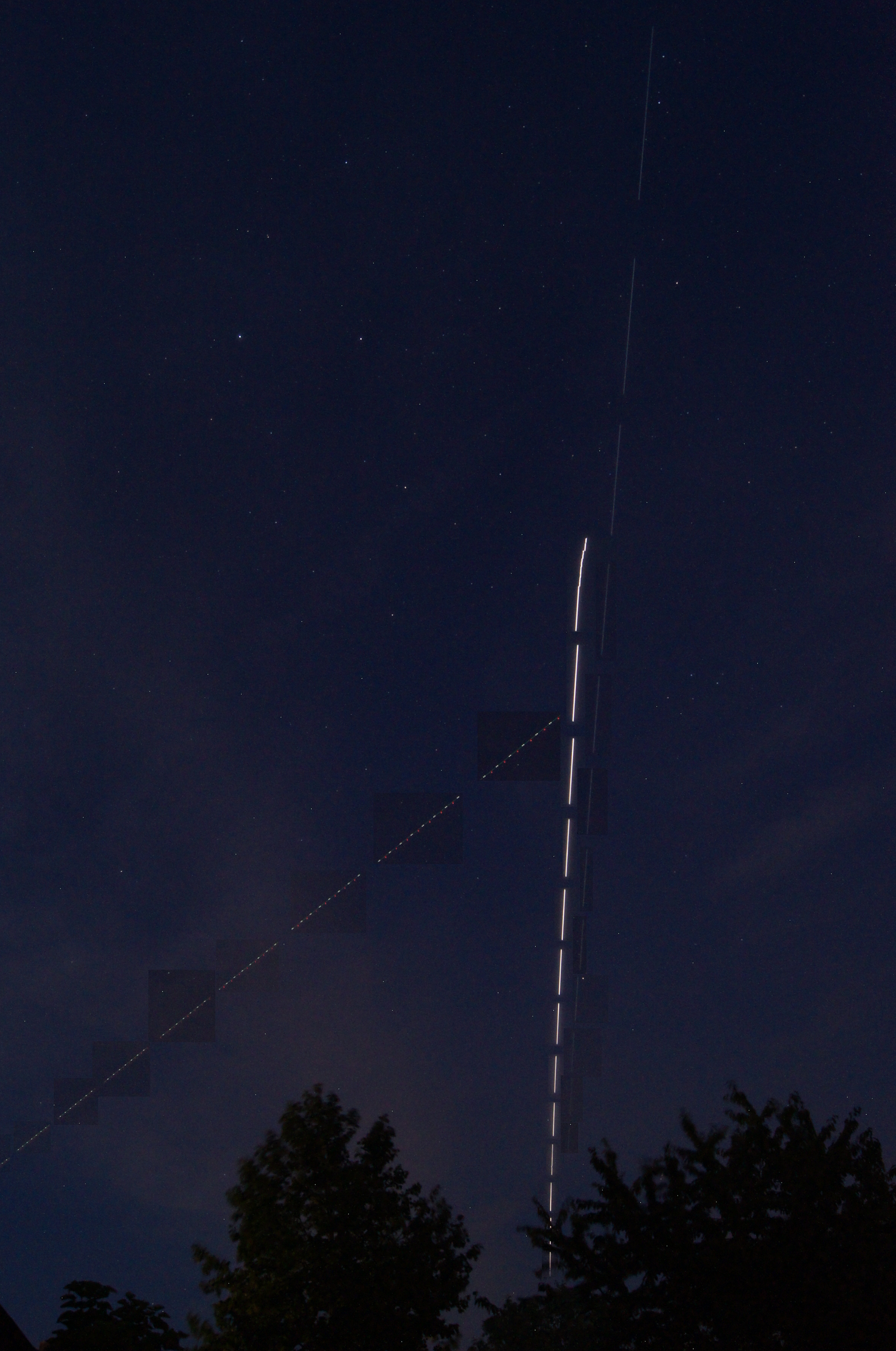 Tags drauf überflogen erst die ISS und dann die sie verfolgende Dragon meinen Wohnort und ließen sich ablichten. Das Bild zeigt sie, als sie dem östlichen Horizont zustreben. Ein Kompositbild ist unten angefügt.