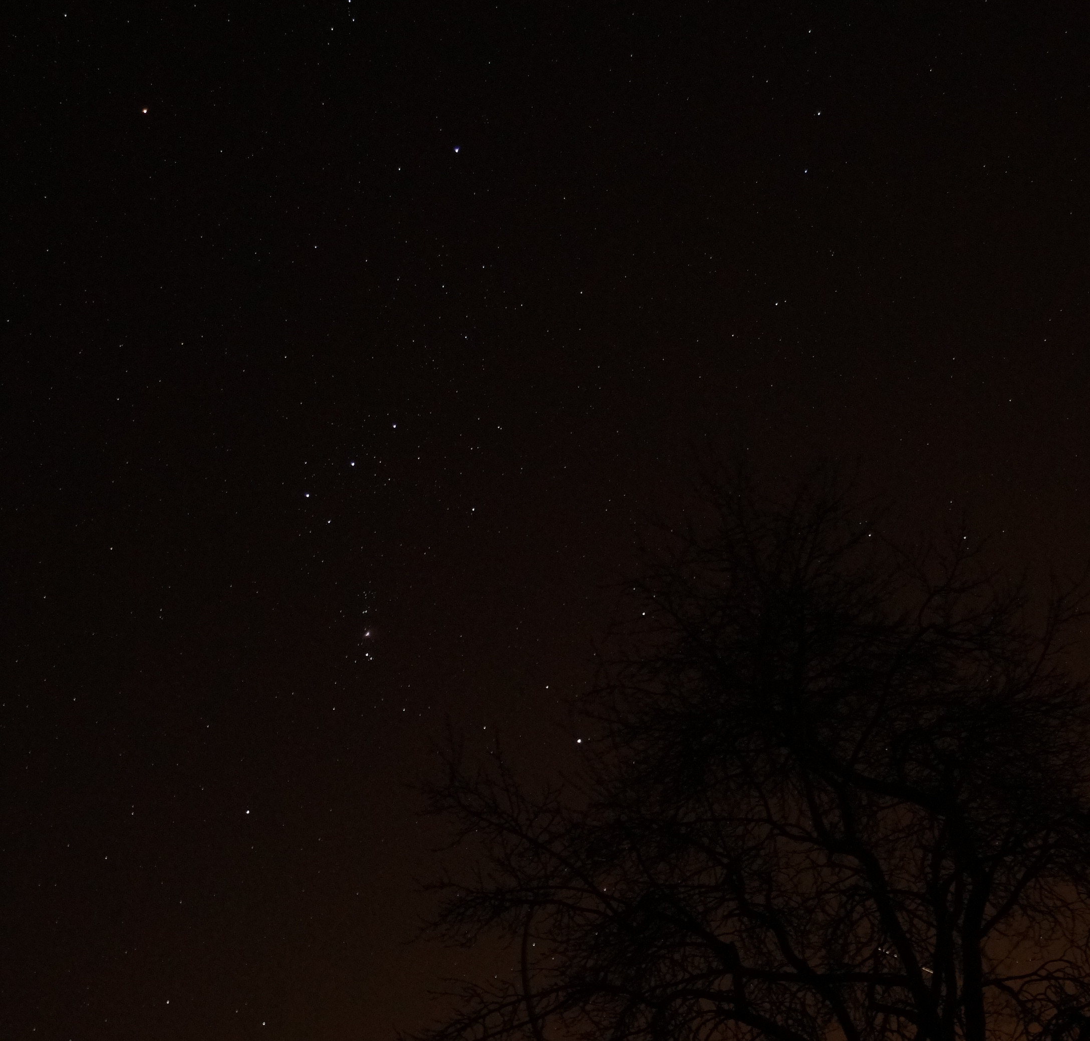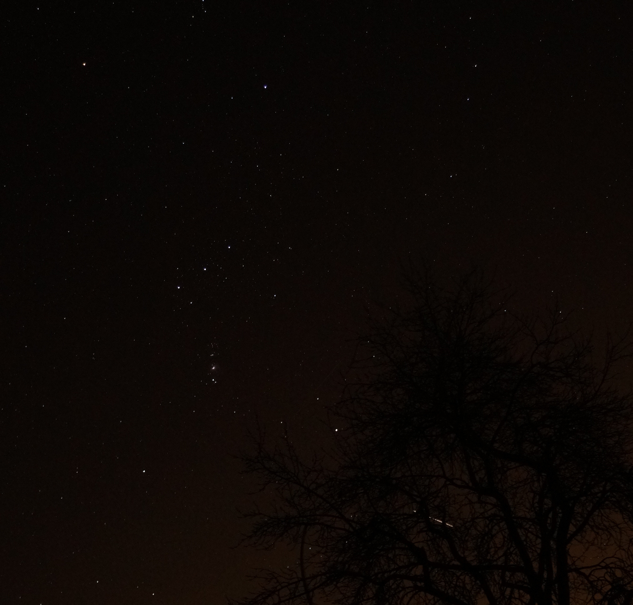 Die Kamera, eine Sony α 58 mit 28-mm-Objektiv, Blendenzahl F/6.3 und ISO 800 war auf einer Nachführung, StarAdventurer, montiert und belichtete jeweils 10 Sekunden. Durch die Nachführung ist der Pflaumenbaum im Kompositbild "verschmiert".