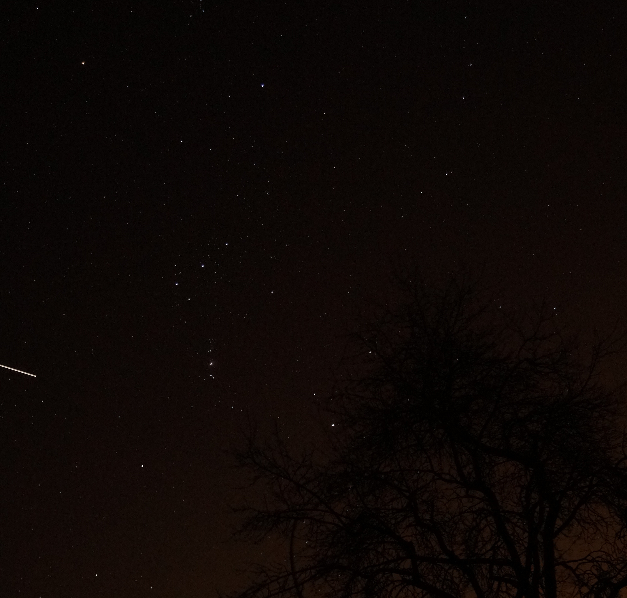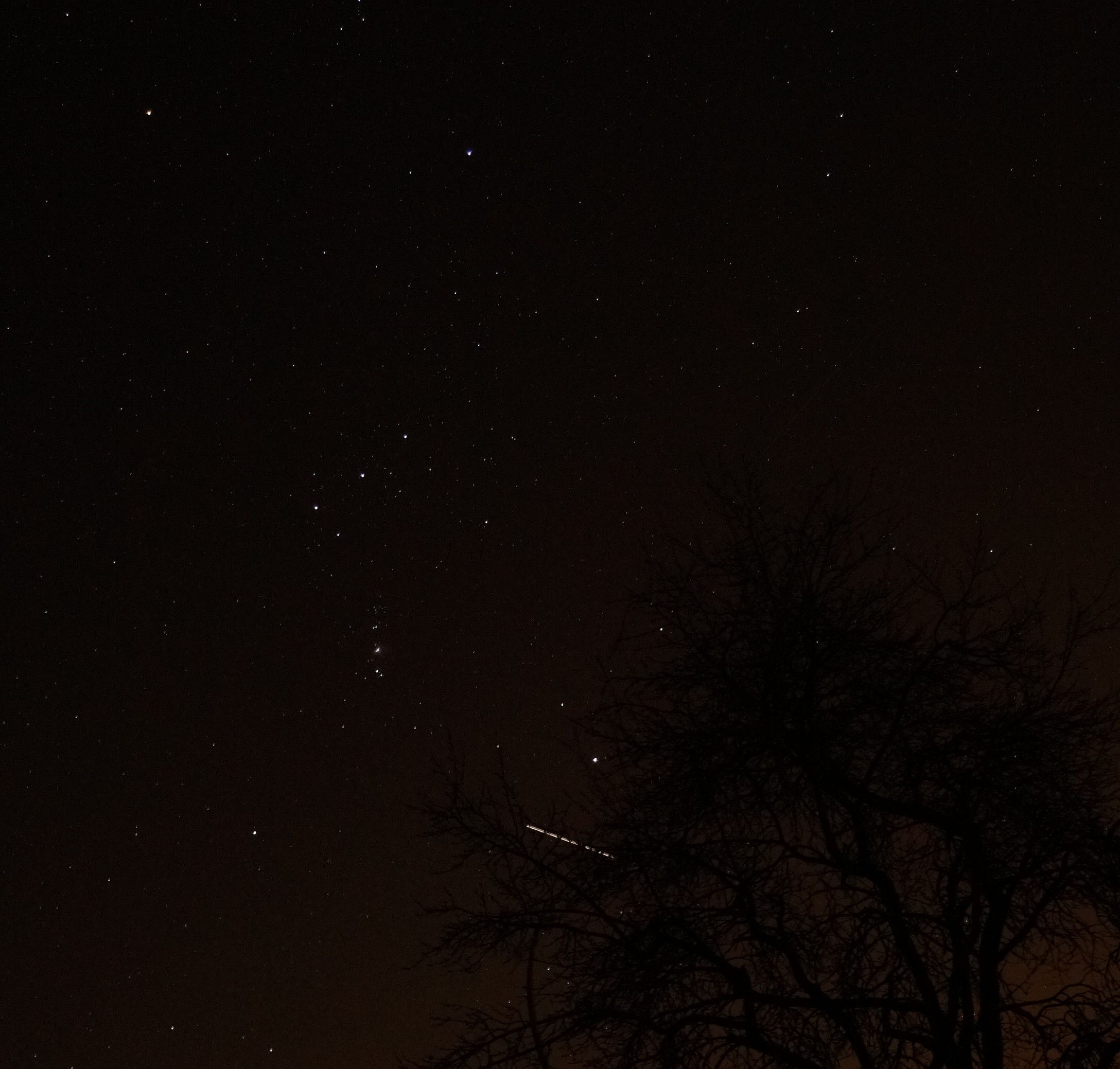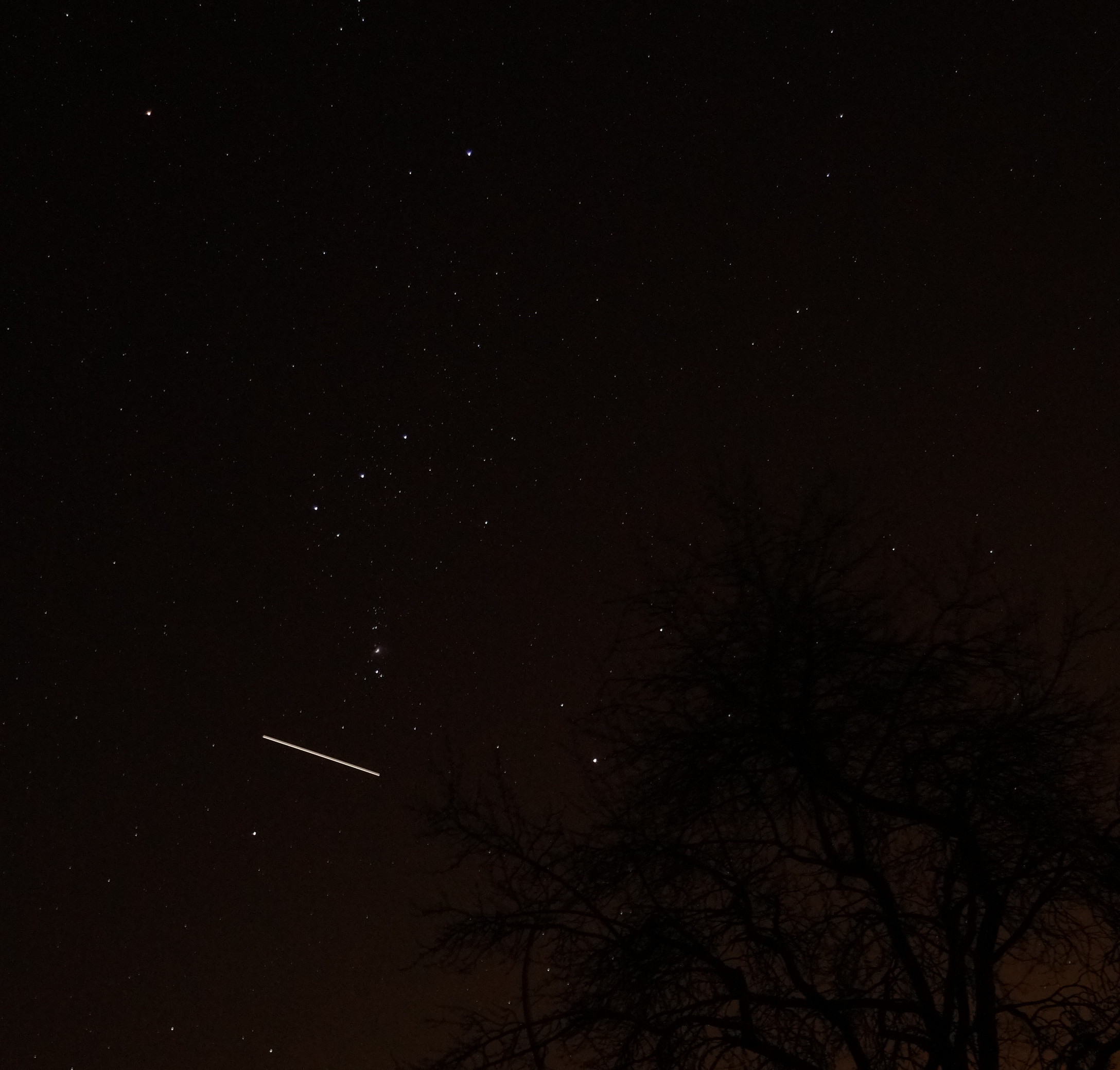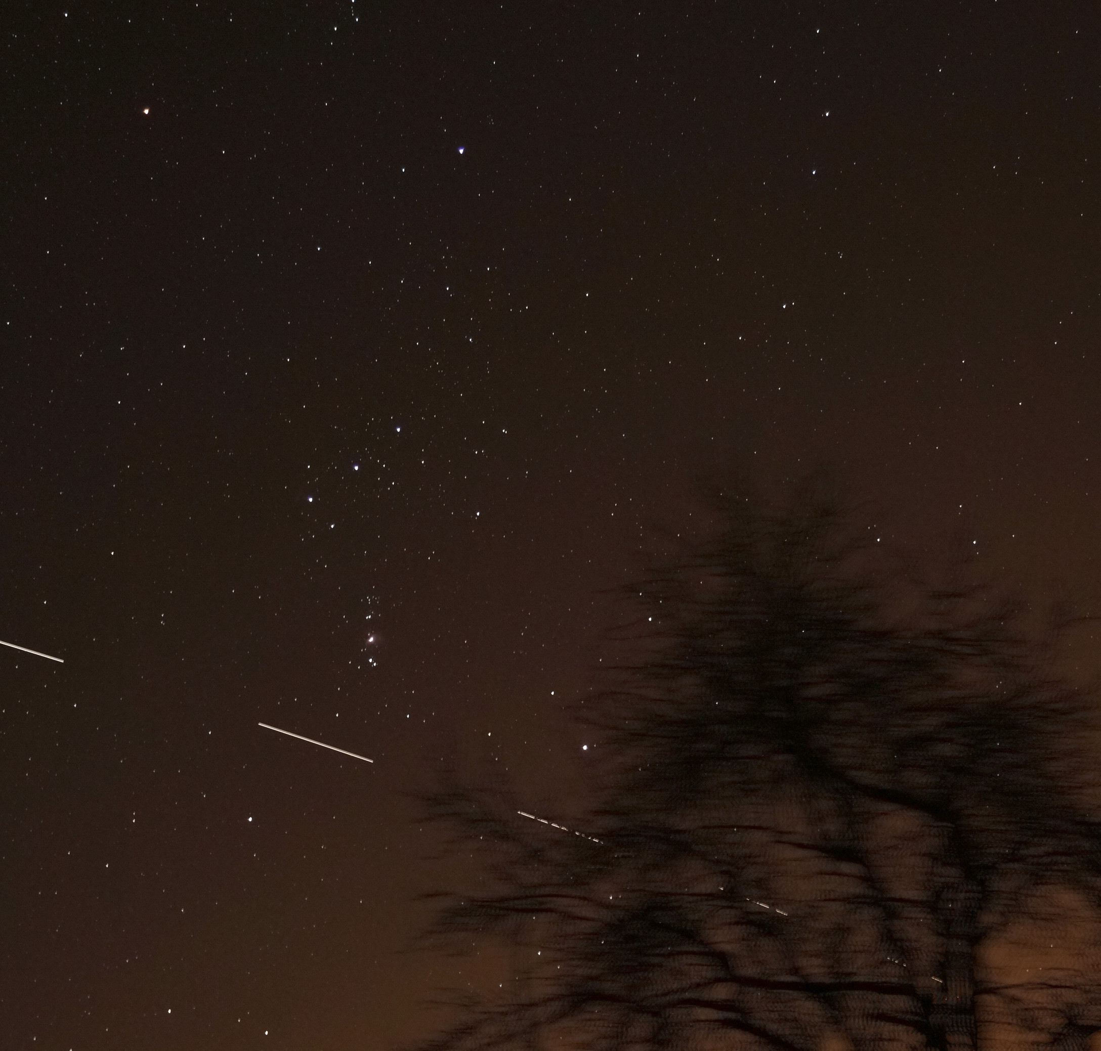 Vom Gartenpatt in Freckenhorst aus gelangen mir zwischen 20:27 Uhr und 20:36 Uhr die hier gezeigten Bilder des Überflugs der ISS: die Raumstation huscht vor dem Sternbild Orion vorbei.