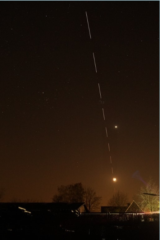 Zwischen 20:38 und 20:41 konnte ich am 27.03.2020 einen Überflug der Internationalen Raumstation ISS fotografieren, der fast senkrecht über meinen Wohnort Freckenhorst führte. Aus den zehn, jeweils 10 Sekunden belichteten Aufnahmen habe ich ein Komposit-Bild erstellt. Die Bahn der ISS führt direkt vor dem Mond und dem offenen Sternhaufen der Plejaden entlang. Der helle Stern oberhalb des Mondes ist unser innerer Nachbarplanet, die Venus. Ein Klick auf das Bild zeigt es in Original-Auflösung.
