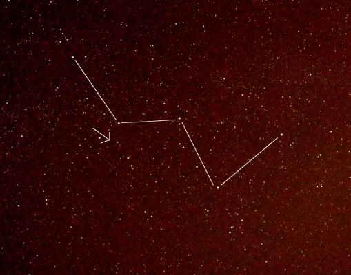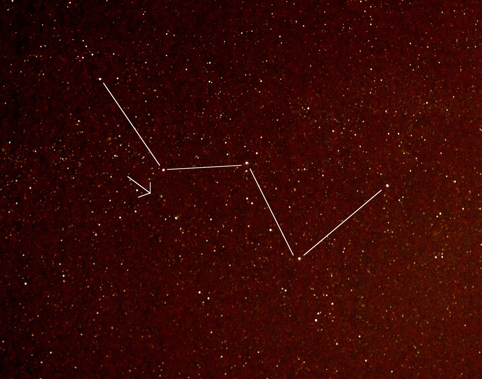 Auf dem annotierten Bild ist der Komet Lovejoy zu erkennen, der schon nicht mehr freiäugig sichtbar war und sich vom Stier über den Perseus bis hier bewegt hatte.