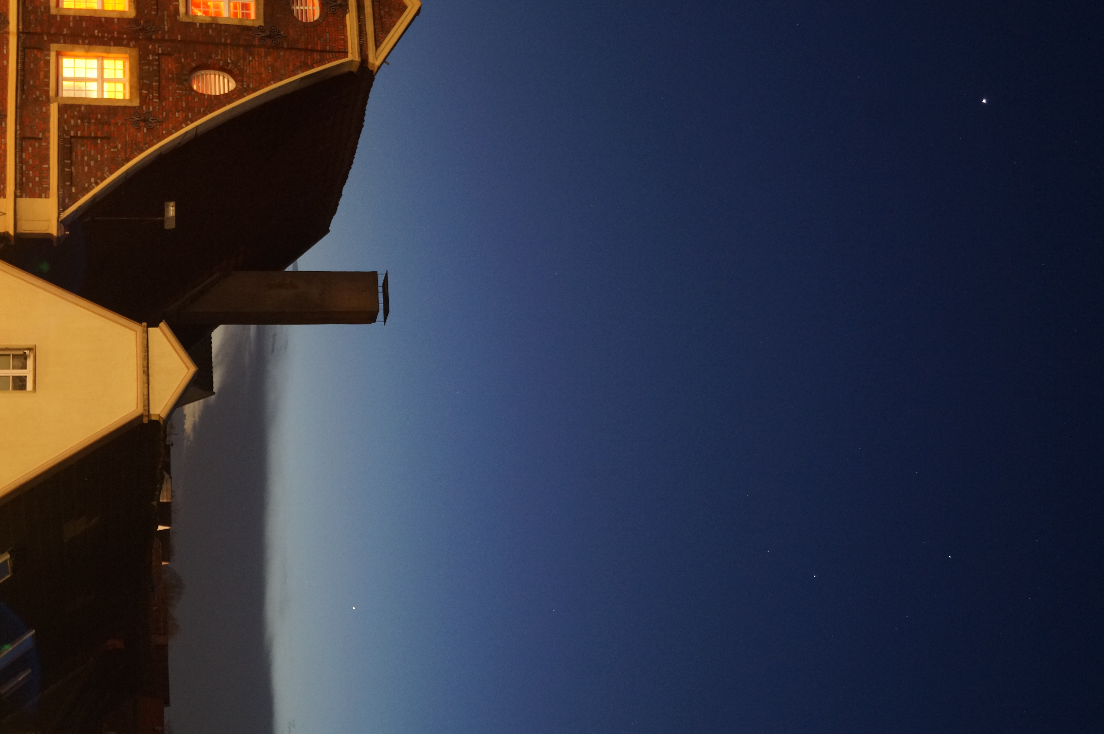 Das erste Foto zeigt im Vordergrund links den dunklen Giebel des "Cafe Extrablatt" und rechts daneben den Giebel der jetzigen Eisdiele. Der helle "Stern" links oben ist der Planet Jupiter. Die drei Sterne rechts im Bild gehören zum Sternbild Widder und knapp über den heranziehenden Wolken ist Merkur zu erspähen. Klick auf das Bild öffnet das größere, nicht annotierte Originalbild.