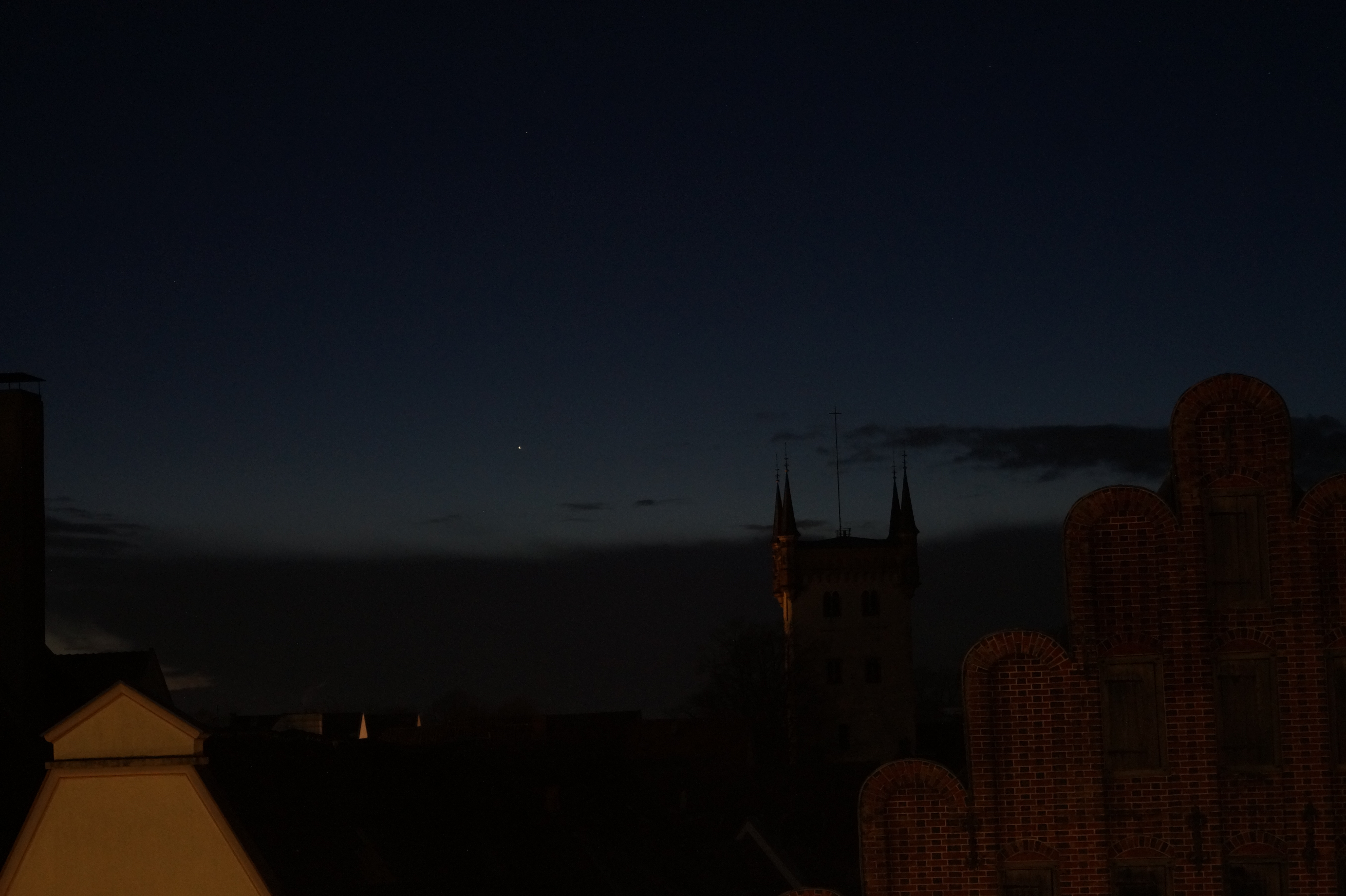 Drei Minuten später gelang dieses Foto. Links unten ist wieder der Giebel der Eisdiele zu sehen, rechts der Treppengiebel der Gastwirtschaft "In Mezzo" und dazwischen die Silhouette des Turms der alten Marien-Kirche. Zwischen Eisdiele und Kirche unverkennbar am Horizont: Merkur.