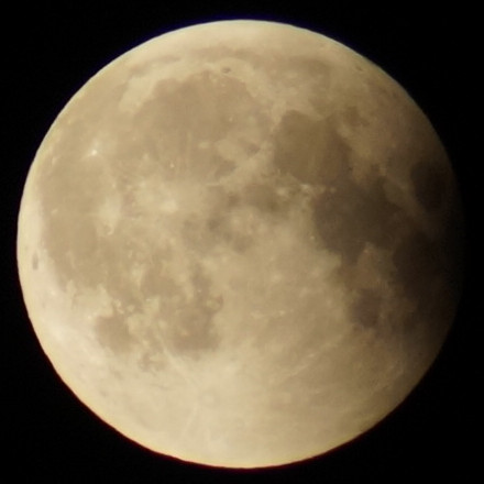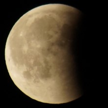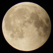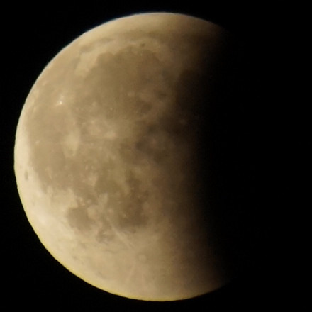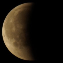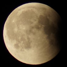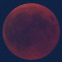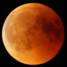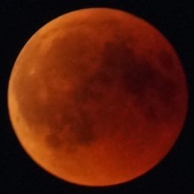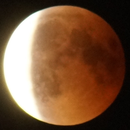 Schön zu sehen ist die intensive Rotfärbung des Mondes während der Totalitätsphase. Rotes Licht wird durch die Erdatmosphäre stärker gebrochen als blaues Licht und erreicht so doch noch den Mond.