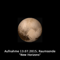 Pluto galt bis 2006 als der äußerste bekannte Planet und kleiner als unser Mond. Zudem besteht er nicht aus Gas, sondern wie die inneren Planeten aus fester Materie. Sein größter Mond, Charon, ist fast halb so groß wie er- beide sind sozusagen ein Doppelplanet. Am 14. Juli 2015 flog die Raumsonde New Horizons an Pluto vorbei uns sandte hochaufgelöste Aufnahmen vom ihm zurück - siehe das obige Foto.
