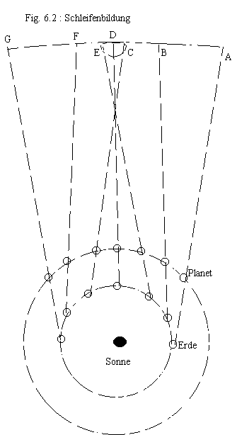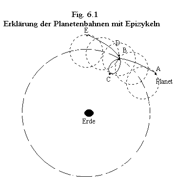 Schon die ersten Beobachtungen zeigten, daß die Planeten sich nicht wahllos durch die Gegend bewegen, sondern ziemlich regelmäßig ihre Bahn ziehen. Obendrein laufen sie alle fast den selben Weg entlang, wenn sie auch unterschiedliches Temperament entwickeln, sprich verschieden schnell sind. Dieser Weg ist just der, den die Sonne auf ihrem scheinbaren Umlauf um die Erde einschlägt - die Ekliptik (siehe 2.2 ). Allerdings ziehen die Planeten nicht einfach so - von Westen nach Osten - ihre Bahn am Himmel; nein, bisweilen werden sie langsamer, bleiben stehen, kehren ihre Laufrichtung für eine Weile um und laufen der Sonne entgegen, um wiederum stehenzubleiben und die alte Richtung mit erhöhter Geschwindigkeit wieder aufzunehmen. Die beiden Planeten Merkur und Venus benehmen sich noch viel seltsamer: sie kommen gar nicht so recht von der Sonne weg, schauen einmal westlich, dann östlich an ihr vorbei. Dieser merkwürdige Planetenlauf bereitete den frühen Astronomen reichliches Kopfzerbrechen, wollten sie den Lauf vorhersagen. Und das war wichtig, hing doch nach ihren Vorstellungen von der Konstellation der Planeten das Geschick von König und Volk ab. Der Grund für diese Schwierigkeiten ist heute im nachhinein leicht einzusehen. Es waren zwei Dogmen, die die Sache kompliziert machten: zum einen glaubten die Astronomen, die Planeten bewegten sich - wie der Mond - um die Erde, zum zweiten galt nur die kreisförmige, gleichmäßige Bewegung als den Himmelskörpern angemessen. Folglich versuchten die Gelehrten, aus Kreisen und darauf gestapelten Kreisen eine Bahn zu konstruieren, die die Bewegung eines Planeten wiedergab; es entstand die Epizykeltheorie der Planetenbahnen. (s. Fig. 6.1 ):