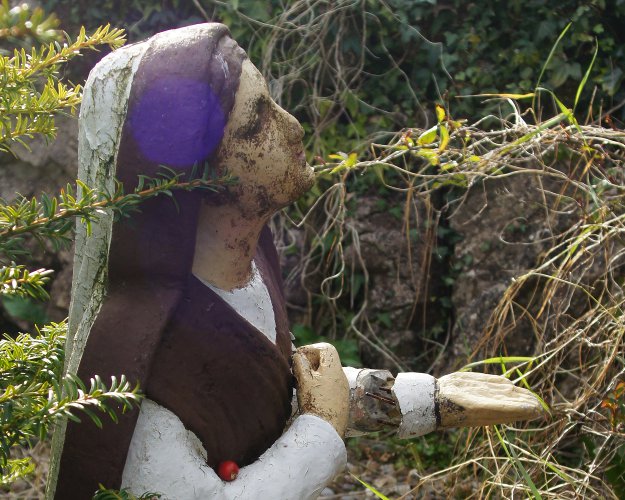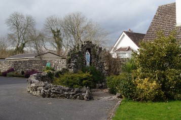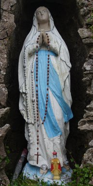 Die 1986 neu erbaute Kirche hat an der Nordseite ein "klassisches" Grotto nebst Bernadette; deren linke Hand