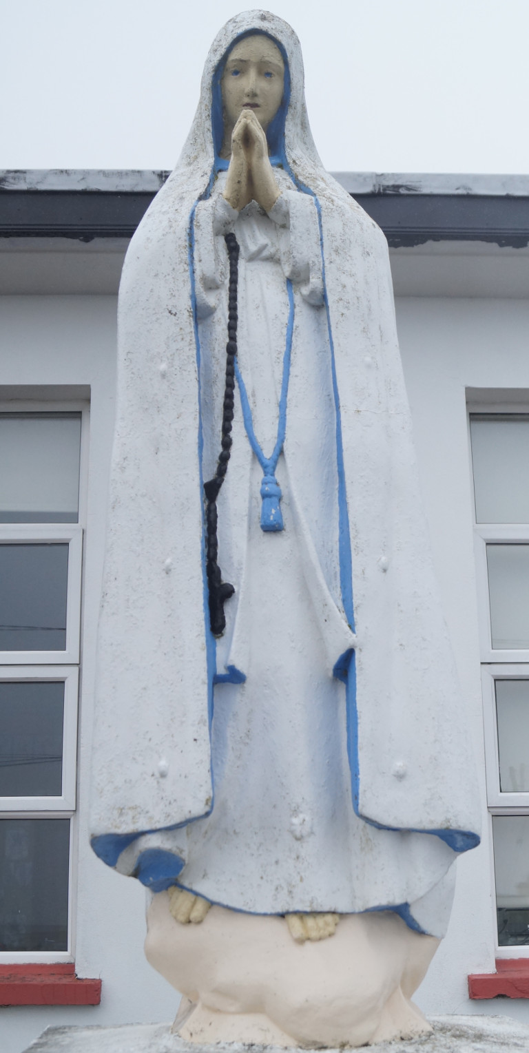 Madonna steht nicht nur auf einer Weltkugel, sondern auch auf einer Säule vor dem Schulgebäude.