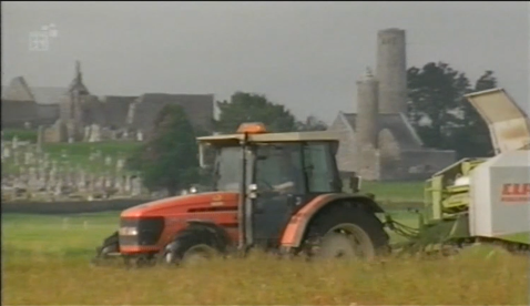 Technik aus Harsewinkel vor der Klosteranlage von Clonmacnoise. Die Mahd verhindert, dass die