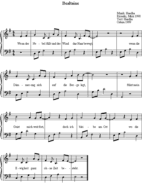 Die Musik schrieb Haedha während einer ihrer Aufenthalte in Finnland. Als wir 1999 gemeinsam Bitburg besuchten, sind wir auf den "Dietzenley", einen alten Vulkankegel südlich von Gerolstein, geklettert. Dort oben, inmitten eines alten Ringwalles, umgeben von den Feuern zur Ostara-Nacht, fiel Haedha der passende Text dazu ein.