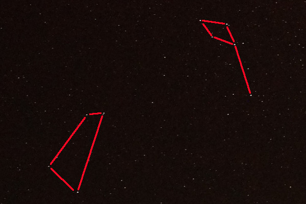 Die folgende Aufnahme zeigt Delphin (rechts oben) und Füllen (links unten) und entstand am 13.08.2024 um 00:10 Uhr. Kamera war die Sony α 58 mit 18-mm-Objektiv, die auf einem Stativ befestigt war.