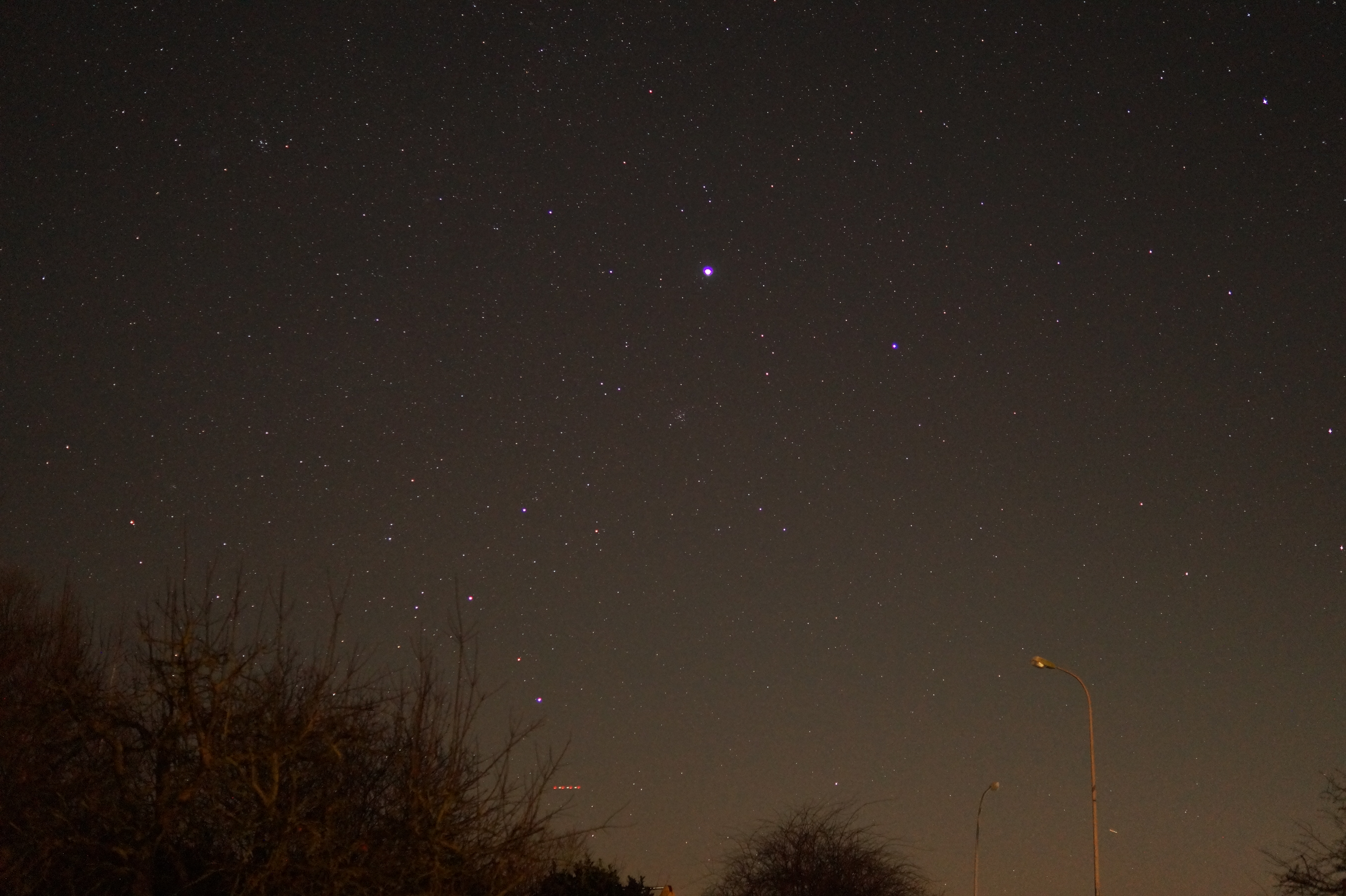 Leider steht der Große Hund so horizontnah, dass die allgegenwärtige Lichtverschmutzung deutlich sichbar wird: Dennoch ist unter Sirius, direkt in der Bildmitte, der Sternhaufen "M 41" zu erkennen. Die folgende Aufnahme entstand am 31.01.2025 um 23:04 Uhr. Kamera war die Sony α 58 mit 35-mm-Objektiv, die auf einem Stativ befestigt war.