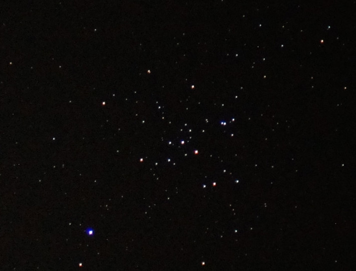 Hier eine Nahaufnahme des Sternhaufens M 41, aufgenommen am 01.02.2025 um 23:23 mit obiger Kamera bei ISO 1600, F/5.6, 300 mm Tele und 10 Sekunden Belichtungszeit, nachgeführt mit einer Skywatcher StarAdventurer.