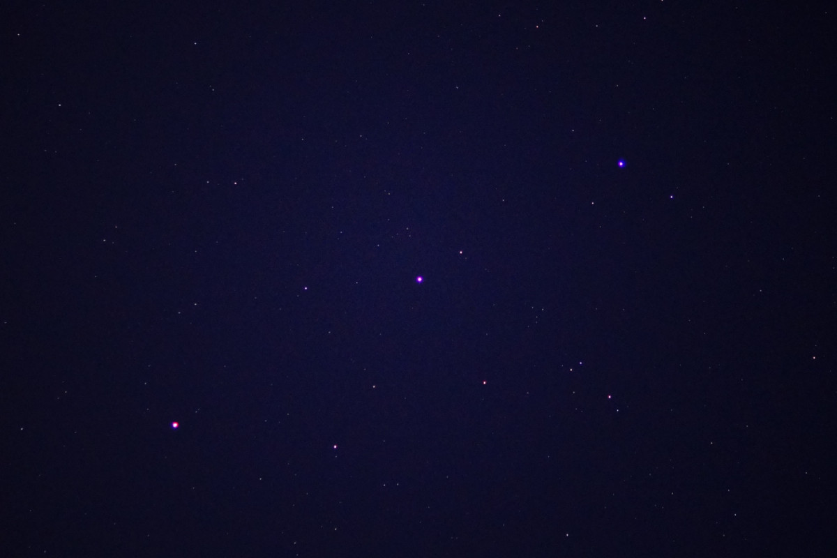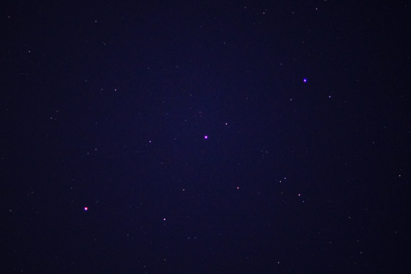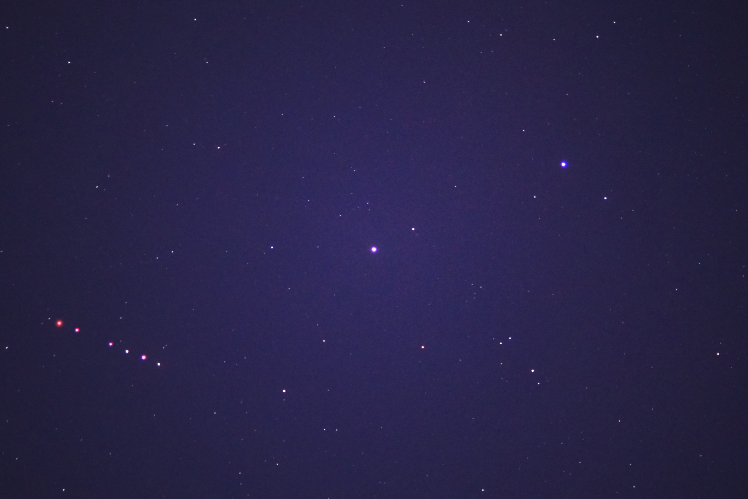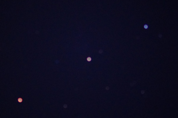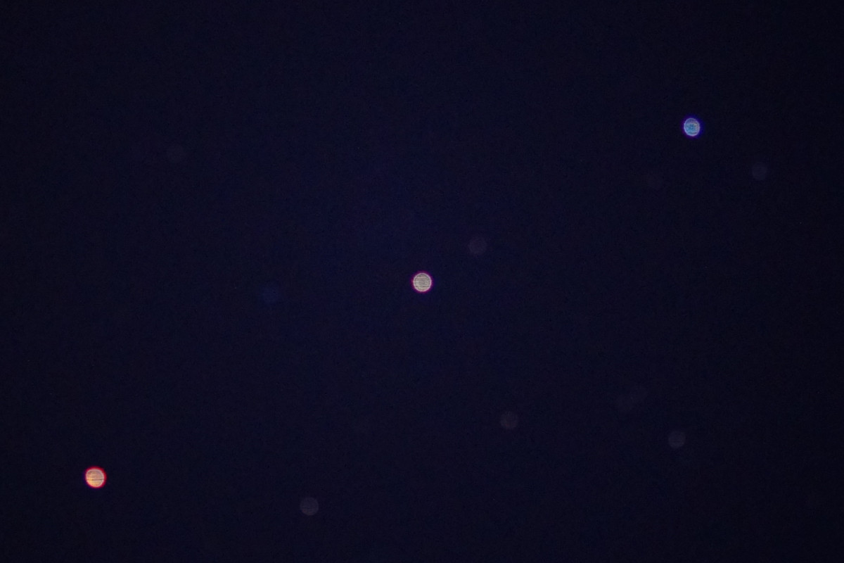 Die zweite Aufnahme ist bewusst unscharf gestellt und zeigt sehr schön die unterschiedlichen Farben; Kastor, rechts oben, ist bläulich, Pollux in der Mitte weißlich und Mars deutlich rot.