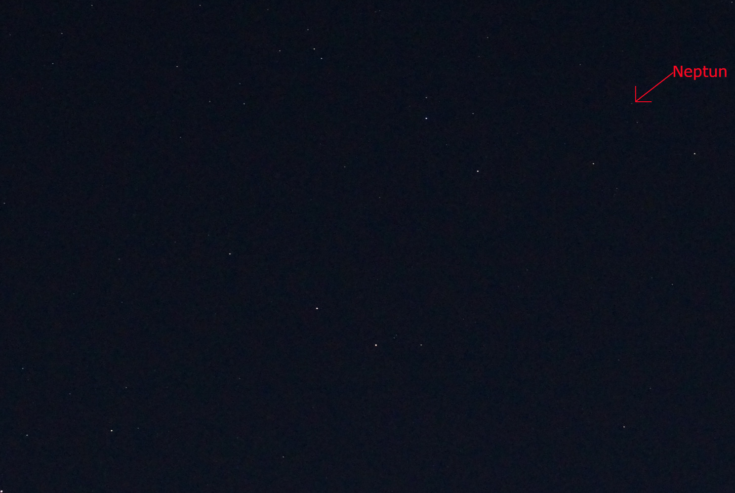 Am 13.01.2025 war der Himmel über Freckenhorst nach schier endlosen Nebeltagen endlich wieder klar. Ich habe die Gelegenheit benutzt, um die freiäugig sichtbaren, gleichzeitig am Himmel stehenden Planeten Venus, Saturn, Jupiter und Mars zu fotografieren. Da ich aus dem von mir sehr geschätzten "Kosmos Himmelsjahr" wusste, wo in etwa Neptun zu suchen sei, habe ich meine Kamera auf die entsprechende Himmelsregion gerichtet und, siehe da: Neptun ist als winziger, leicht bläulicher Lichtpunkt auf dem Foto zu identifizieren!