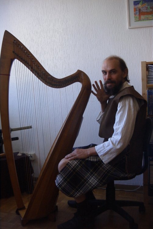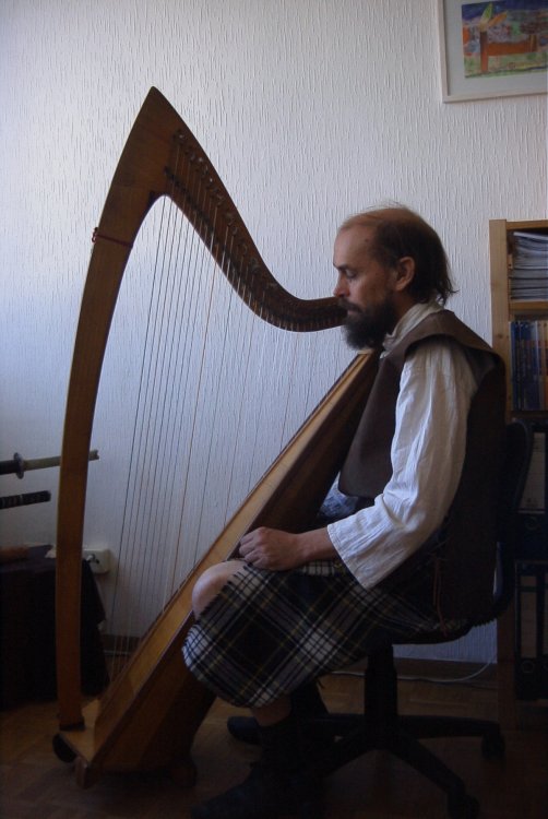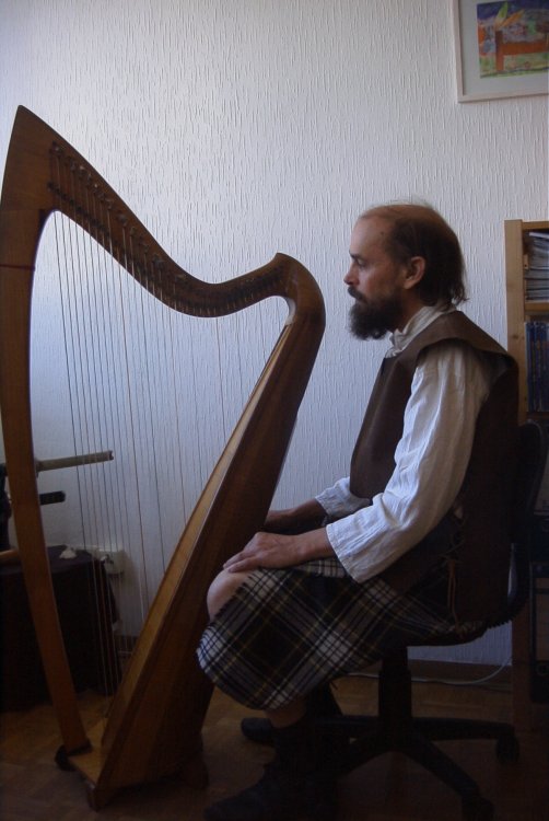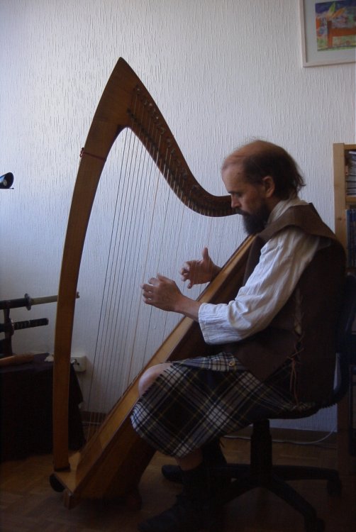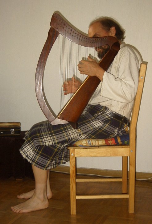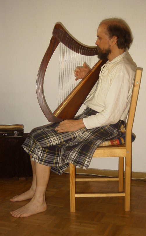 Diese kleinen, etwa dreioktavigen Harfen setzt der Harfner nicht auf dem Boden, sondern auf seinem rechten Oberschenkel in Richtung des